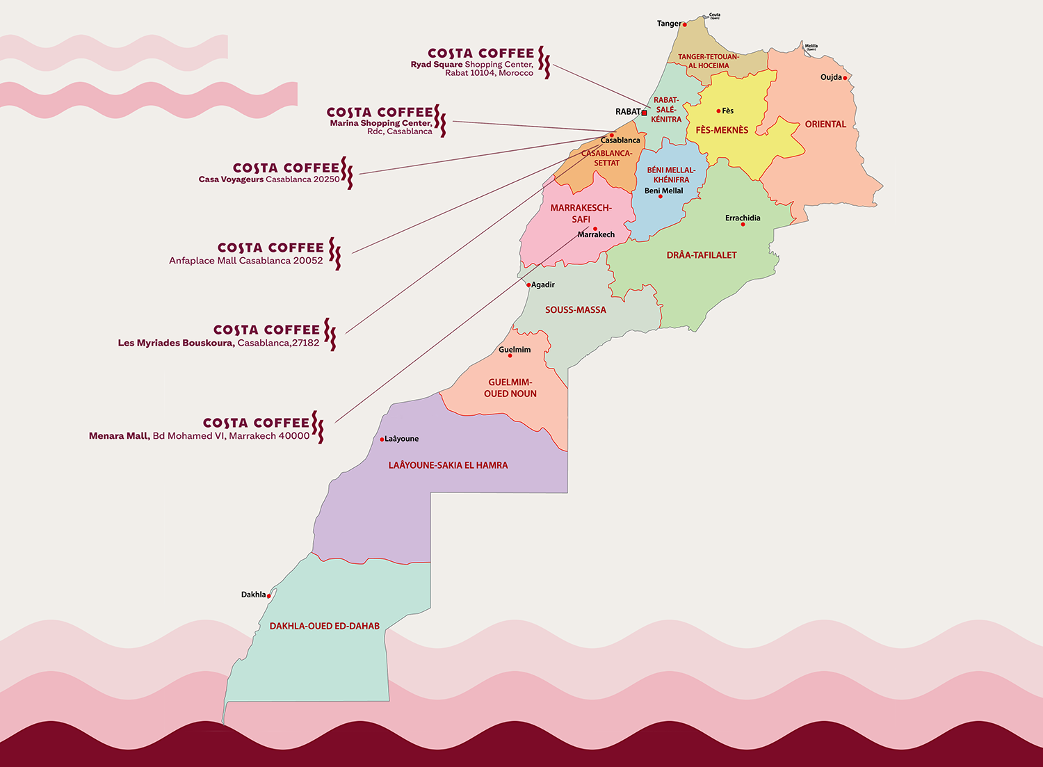 Venez nous rendre visite dans nos stores à Marrakech, Casablanca et Rabat, où vous pourrez déguster le mélange parfait d'options rafraîchissantes et chaudes.